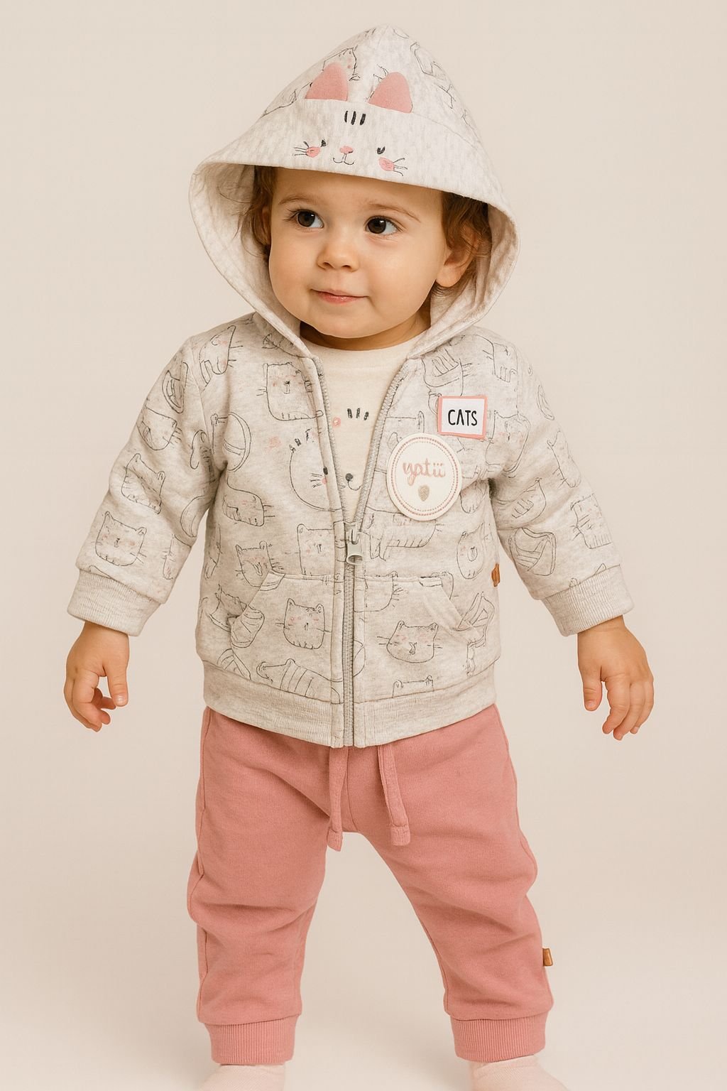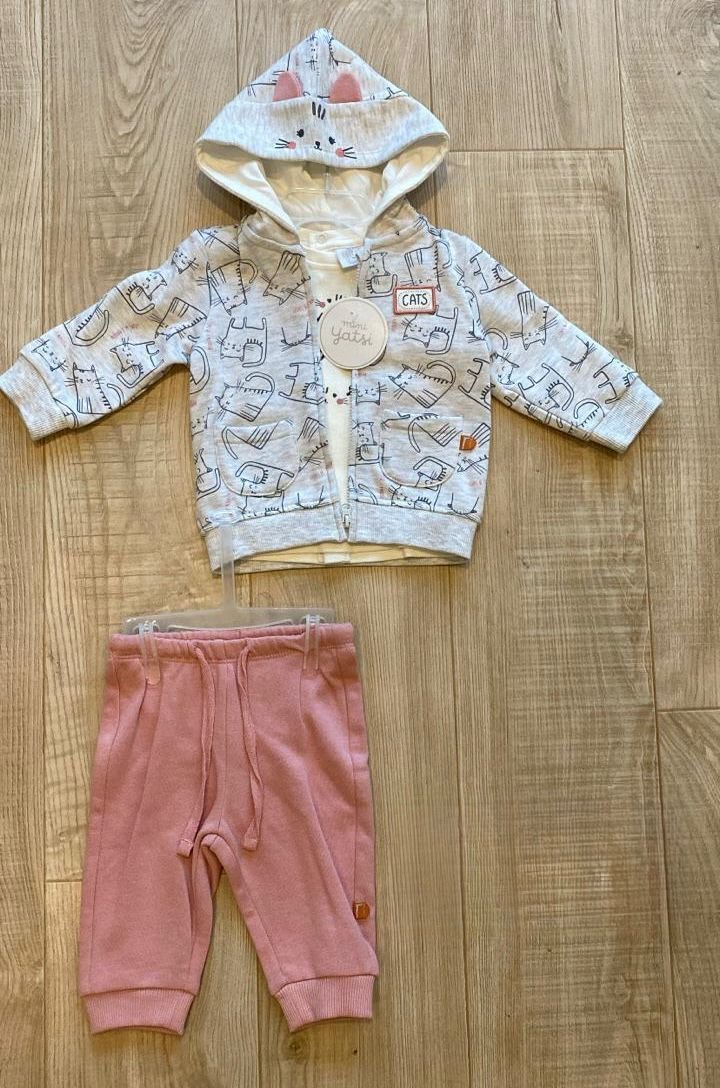 Adorable ensemble pour bébé fille composé d’un sweat à capuche gris clair décoré de petits chats mignons 🐱, d’un t-shirt doux en coton et d’un pantalon rose poudré confortable.