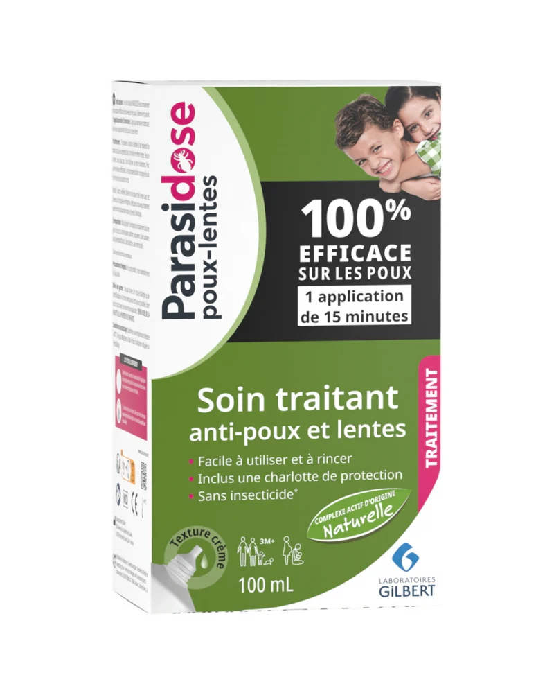 Le Soin Traitant Anti-Poux et Lentes 100 ml de Parasidose est composé sans insecticide chimique, sans paraben, sans phénoxyéthanol et sans allergène.