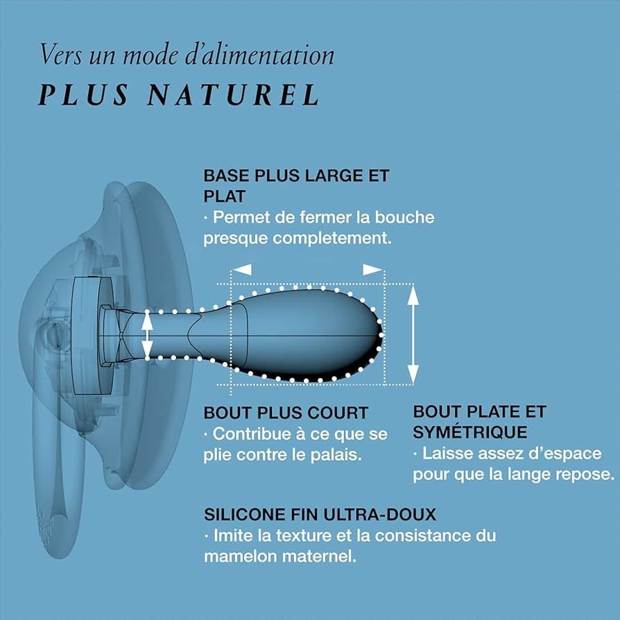 Succion naturelle. Sa forme plate et symétrique laisse plus d’espace pour la langue et permet une succion plus naturelle. Sa base plus fine permet à bébé de fermer presque complètement la bouche. Plus large, elle répartit mieux la pression sur les gencives et les dents pour respecter le développement bucco-dentaire naturel.