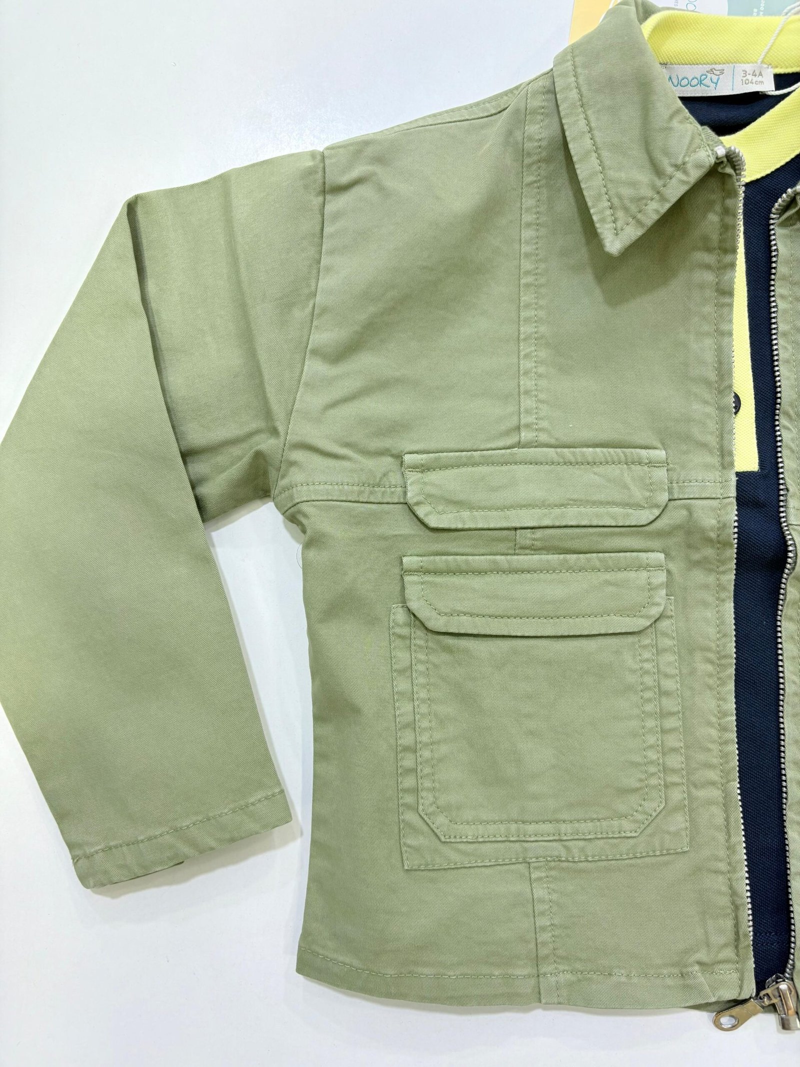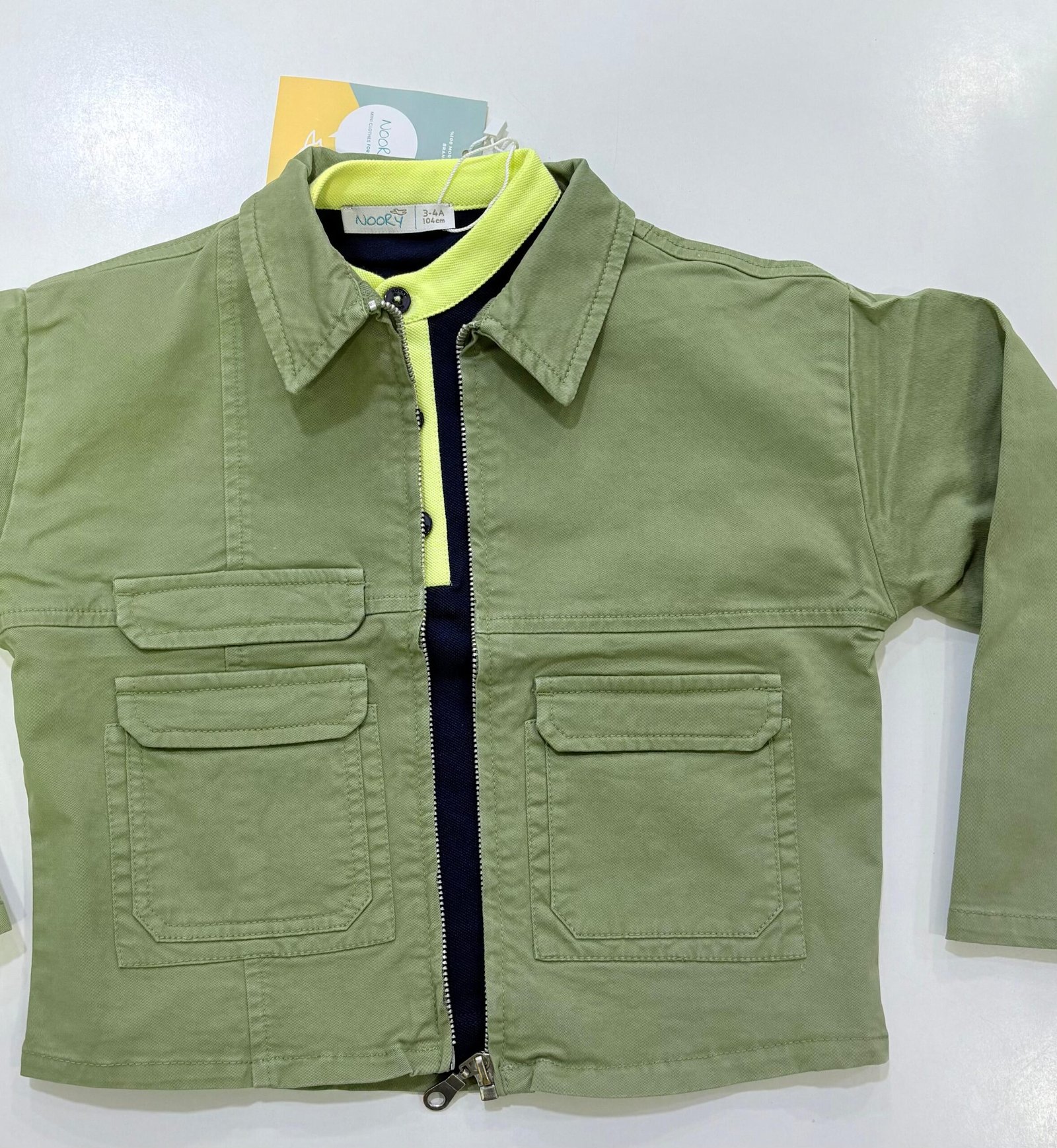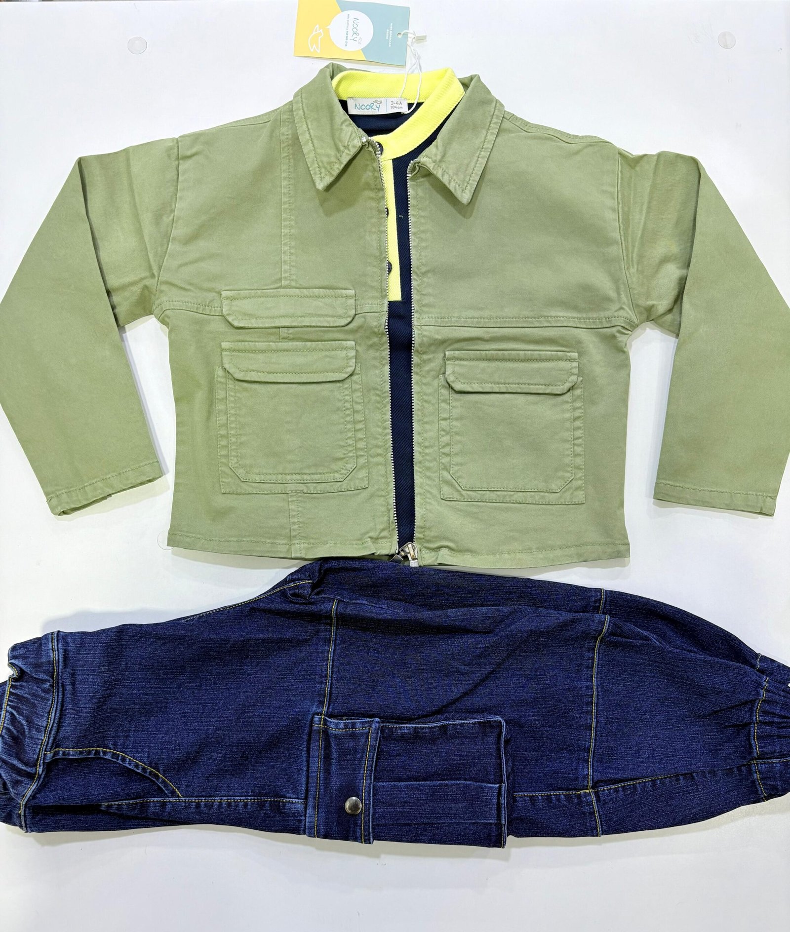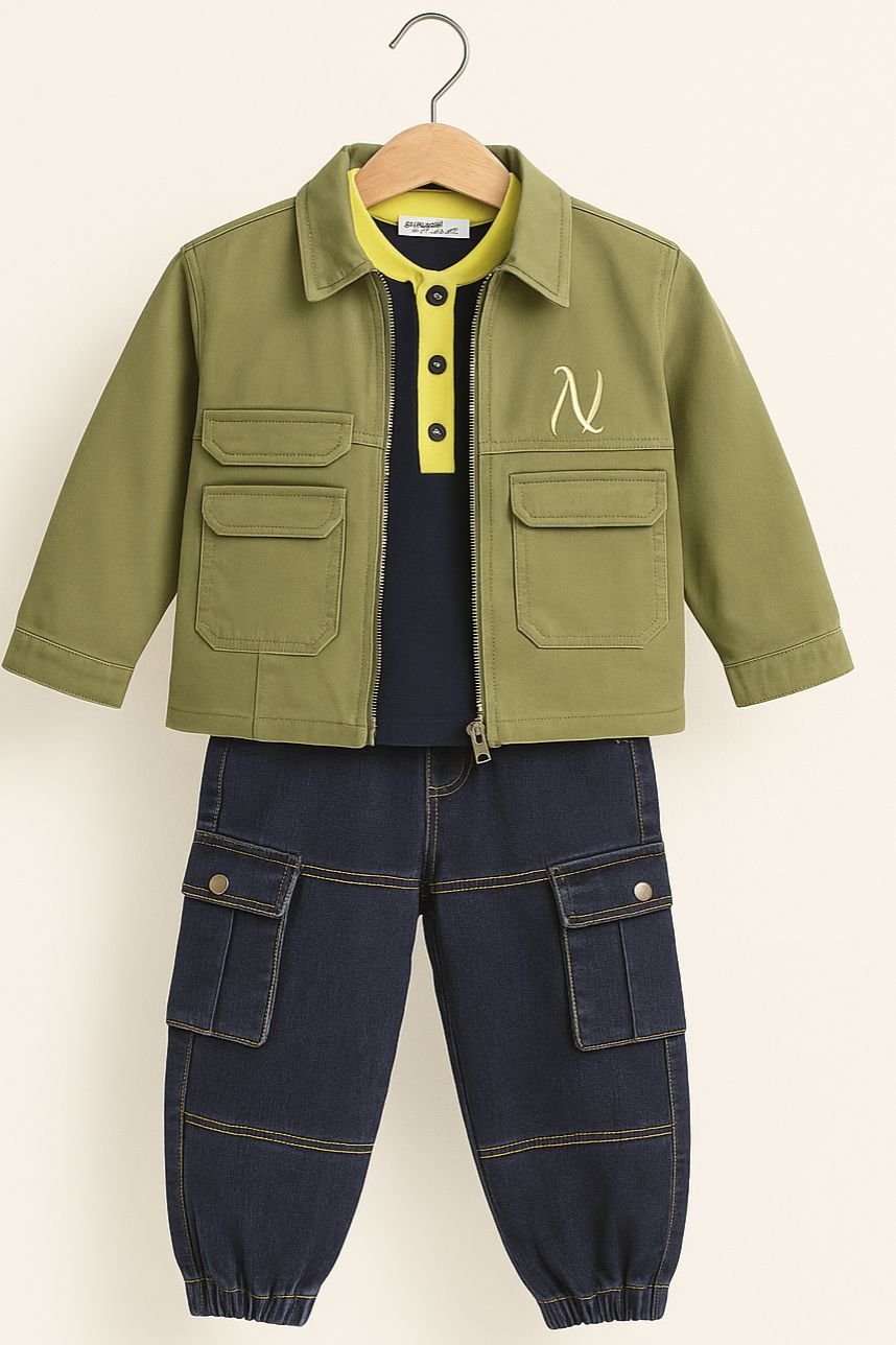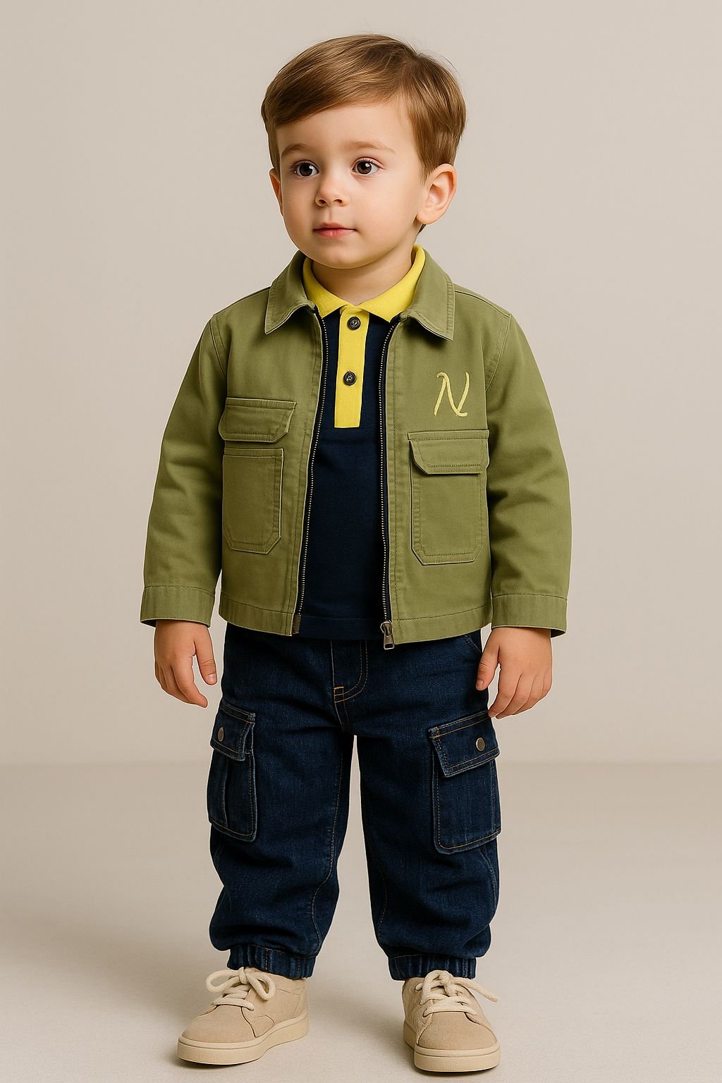 Cette jolie veste kaki associée à un polo jaune vif apporte une touche moderne et élégante à la tenue de votre petit garçon.